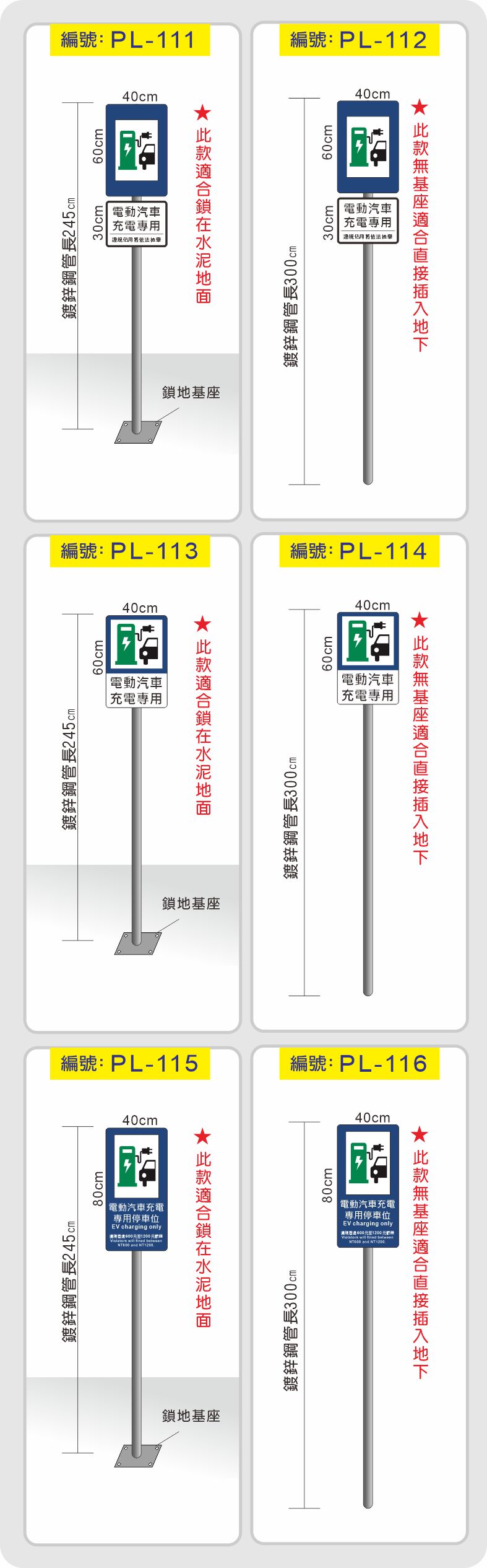 | PL-113 | 板面:2mm鋁板40x60cm+商用級反光貼紙輸出+托架束套 立柱:2"鍍鋅鋼管245cm+鎖地基座(不含鎖地膨脹螺絲) | $3200 | 單面看 |
